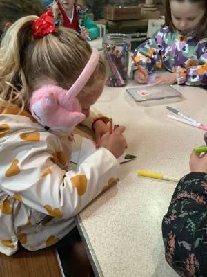 Children listened to a story about animal silhouettes under the light of the moon, then took their clipboards to draw under the exhibit. They added giraffes, dinosaurs and ducks and all sorts of different creatures.