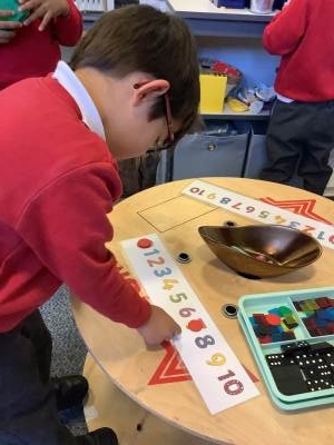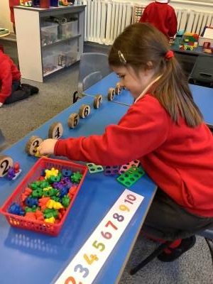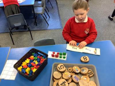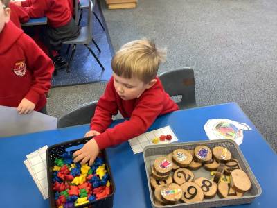 In Maths, children practised counting to a ‘stopping number’; counting an accurate amount of objects to a given total. They discussed how they organised the counting bears, e.g. into 10 frames or lines so that they could check their answer was correct.