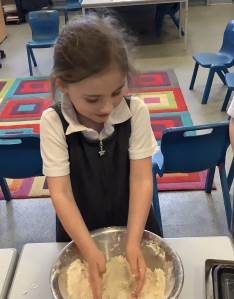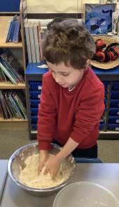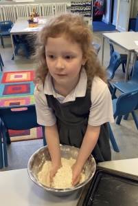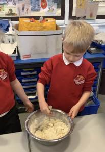 Linked to their work on measures in Maths, Year 1 have been baking scones. They looked at accurate weighing and measuring of the ingredients before combining the ingredients using a rubbing method.