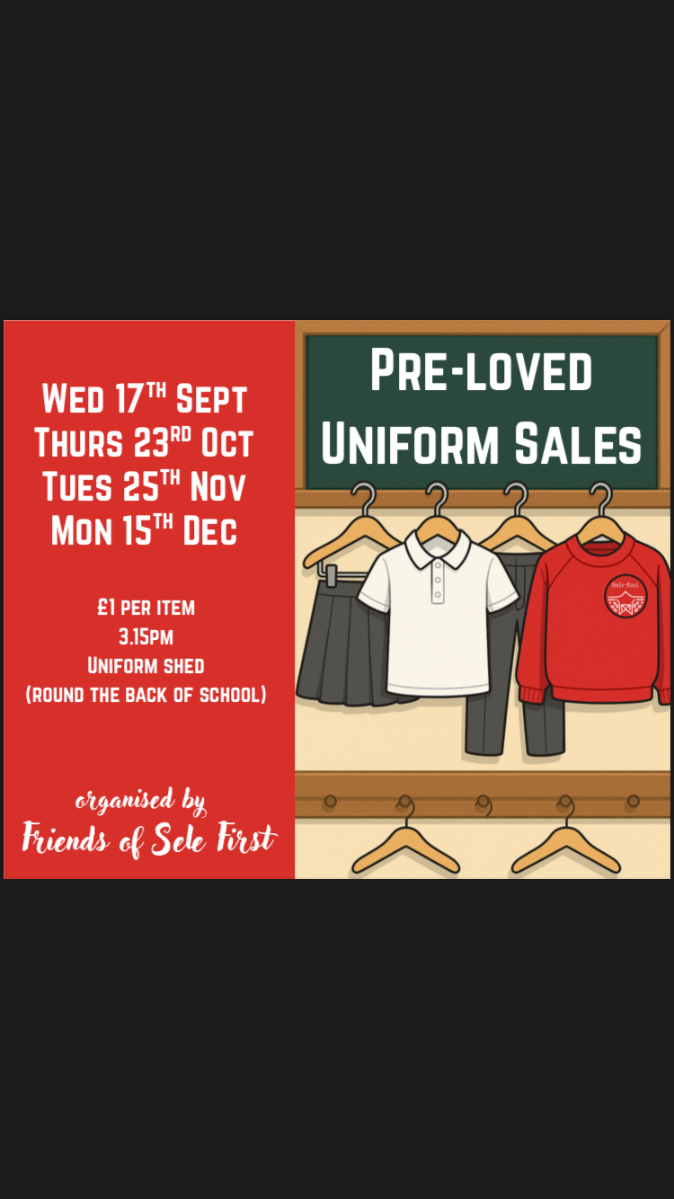 Sele First recycle and resell school uniform in good condition. Uniform can be purchased via the stall at the rear of school monthly. You can also contact the school office to request items at any time. All items cost £2.00.