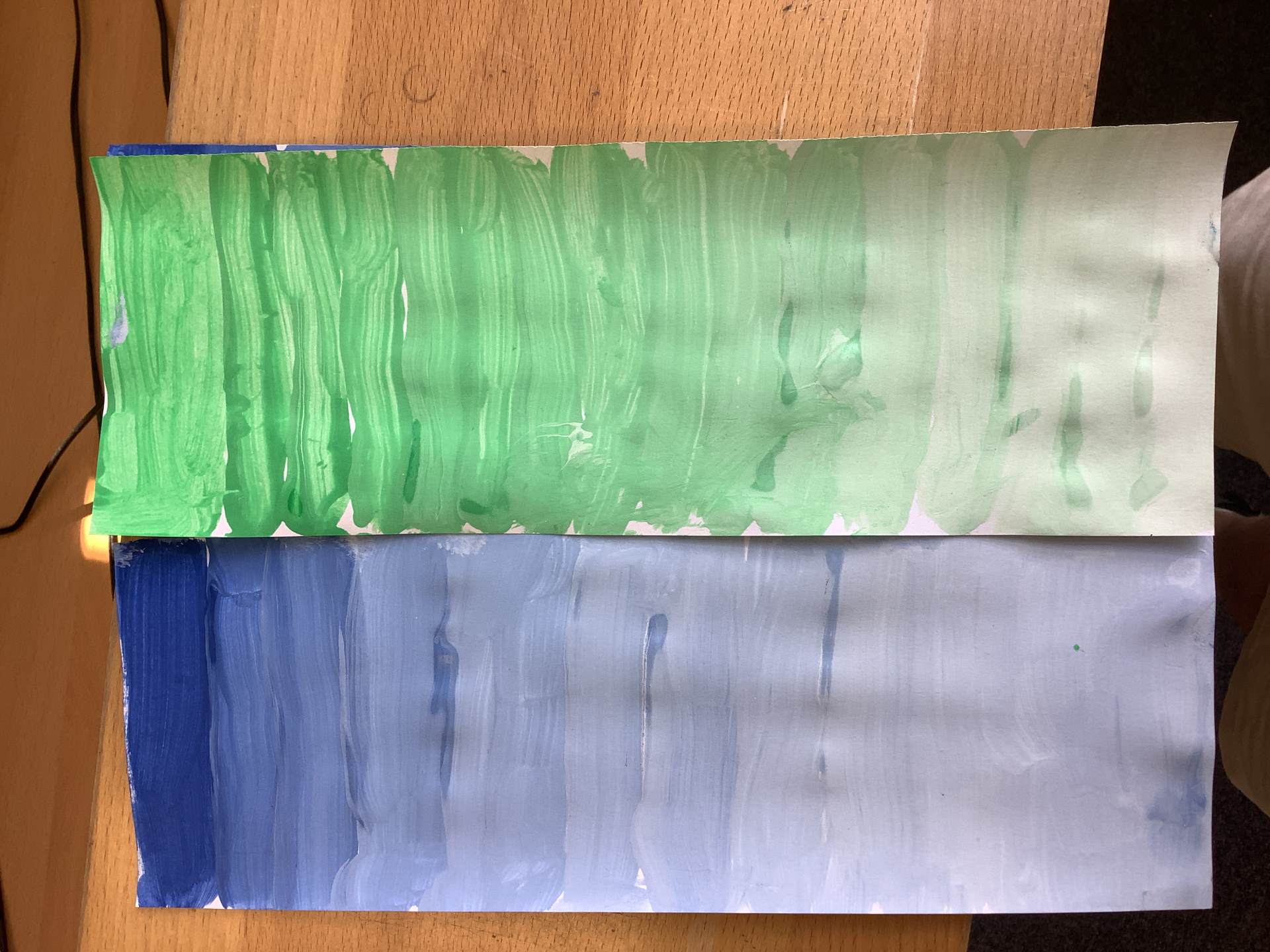 We progressed onto paint, trying to create different greens and blues inspired by the picture.
