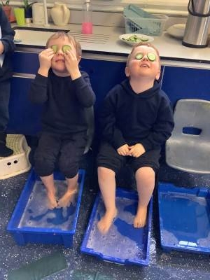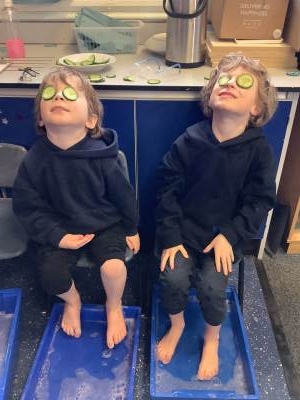 Reception loved Sele Spa! They relaxed with warm water and cucumber eye patches, filled a happiness jar with things that made them happy, wrote positive notes to friends and siblings across school and wound down with books, blankets and cushions on the carpet.