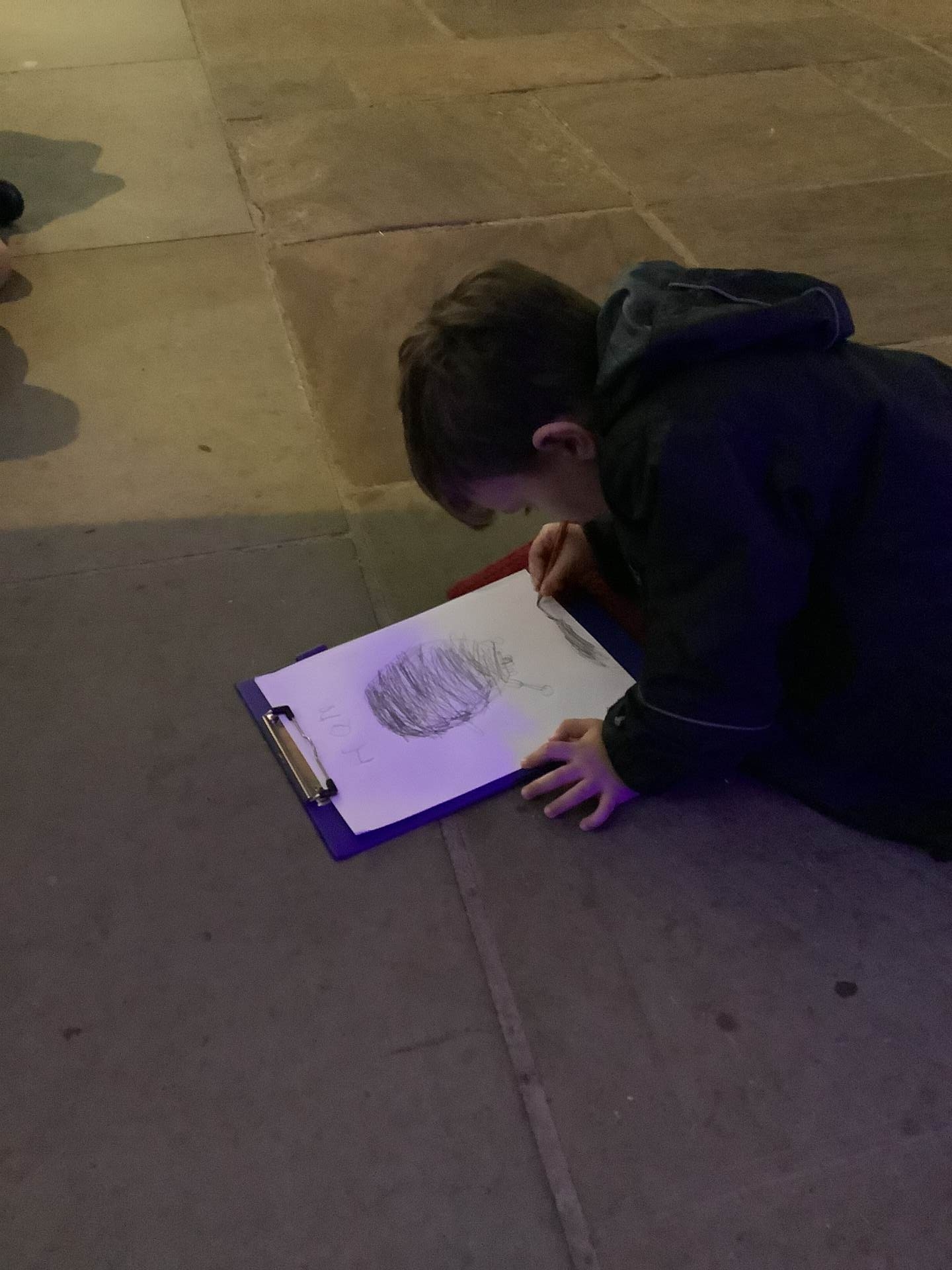 Children listened to a story about animal silhouettes under the light of the moon, then took their clipboards to draw under the exhibit. They added giraffes, dinosaurs and ducks and all sorts of different creatures.