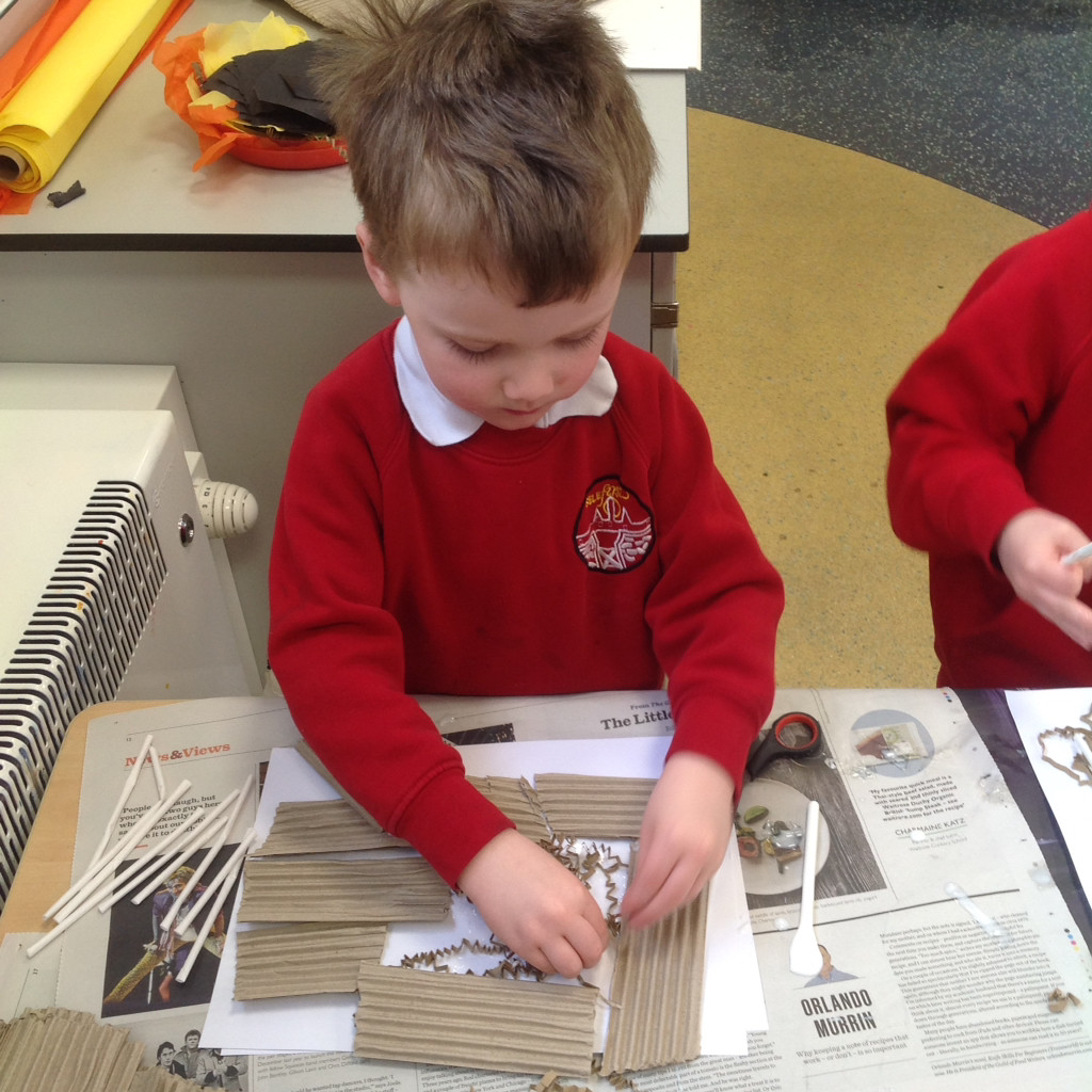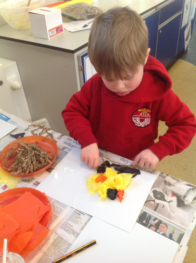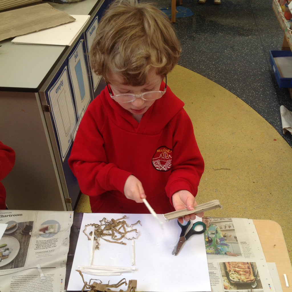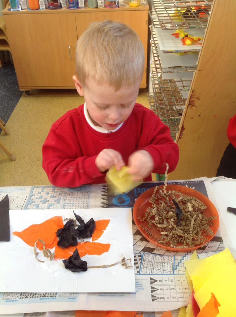 We used recycled materials to create a hen house and collage chick, practicing our cutting skills and spreading glue!