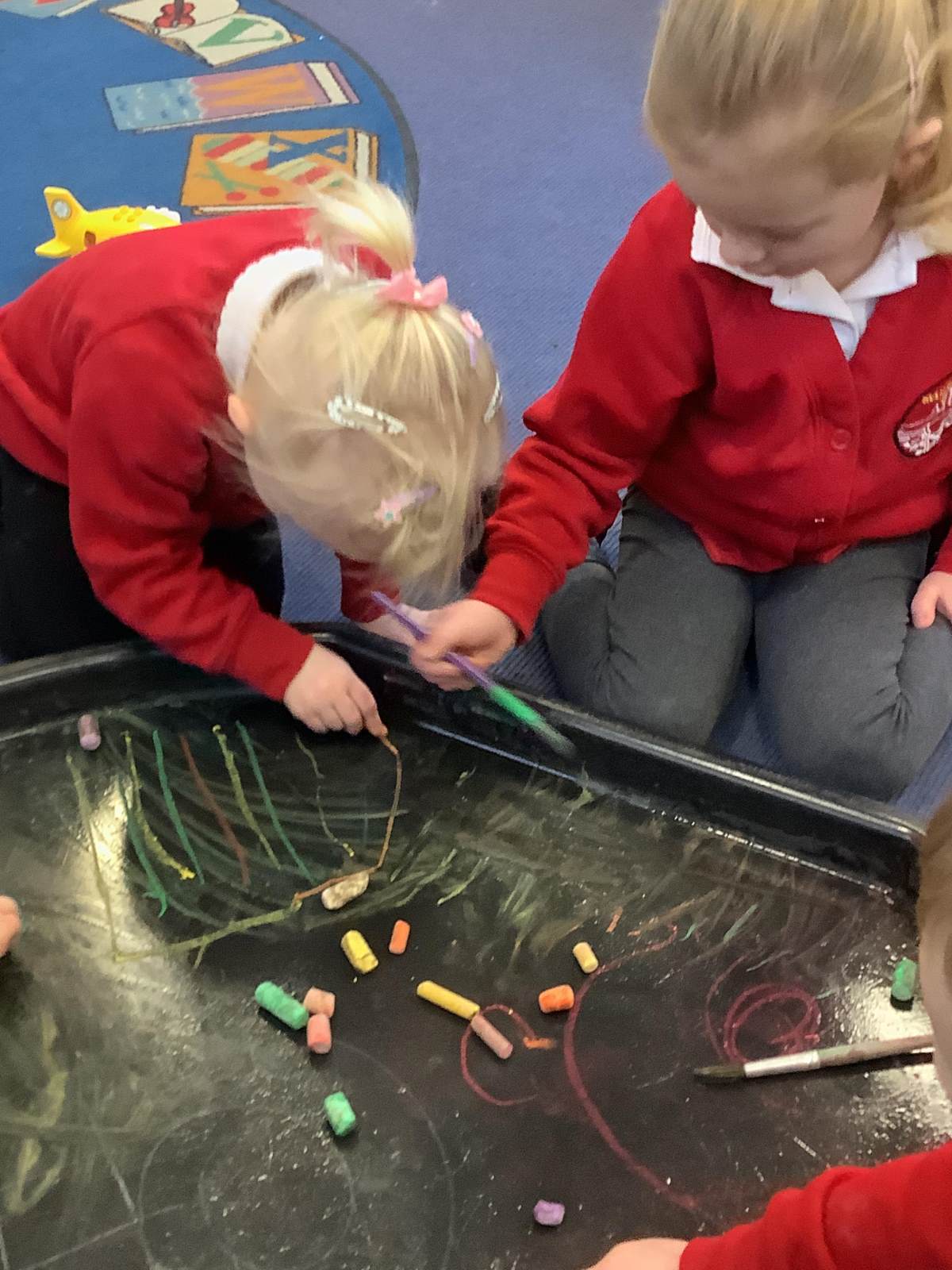 Nursery have enjoyed activities that develop our fine motor skills. Having fun with making marks with chalk and then making them disappear with a brush and water.