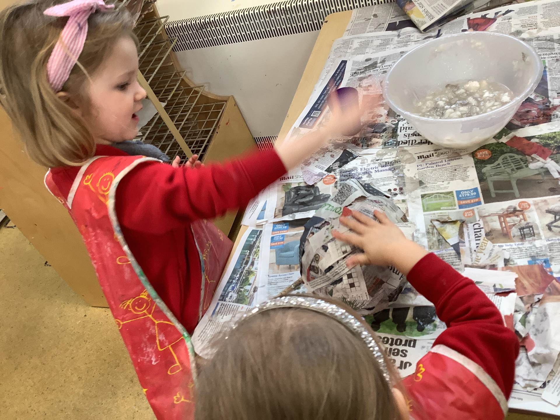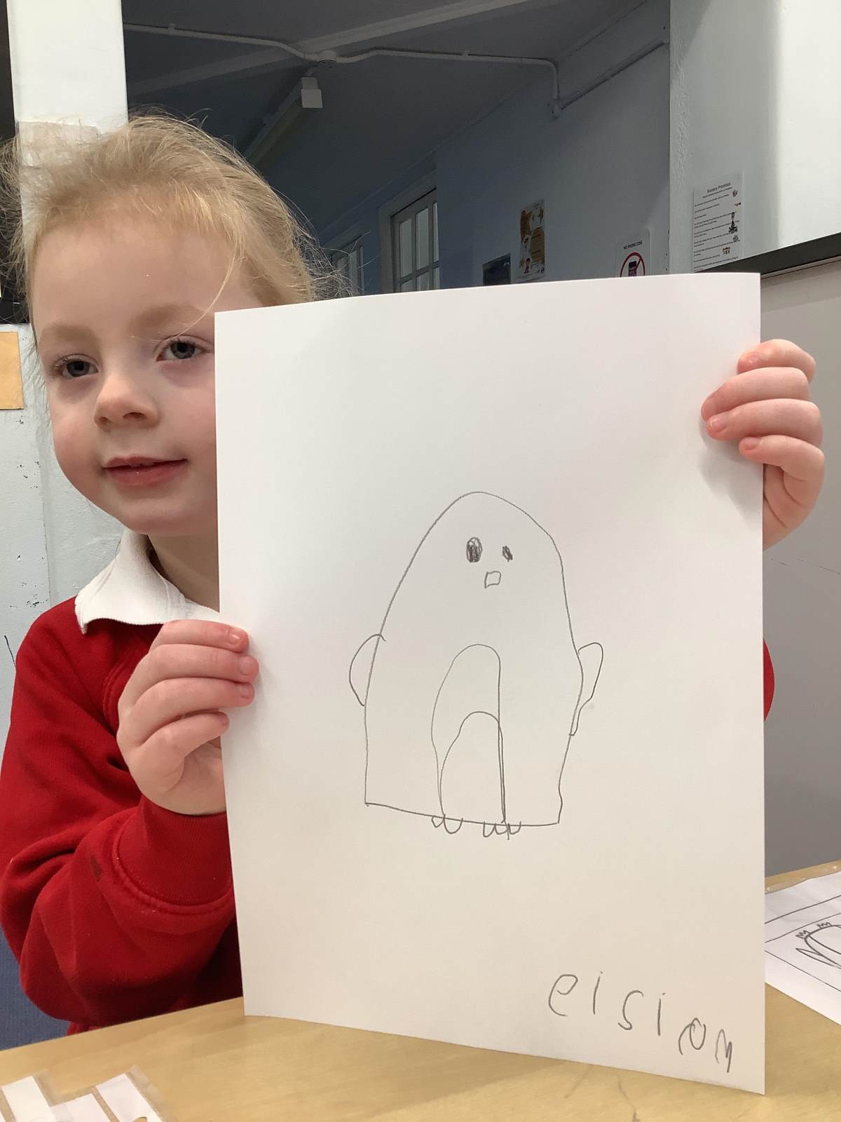 Drawing penguins, looking at a picture to help us! We loved making a paper mache penguin and getting our hands messy in the glue!