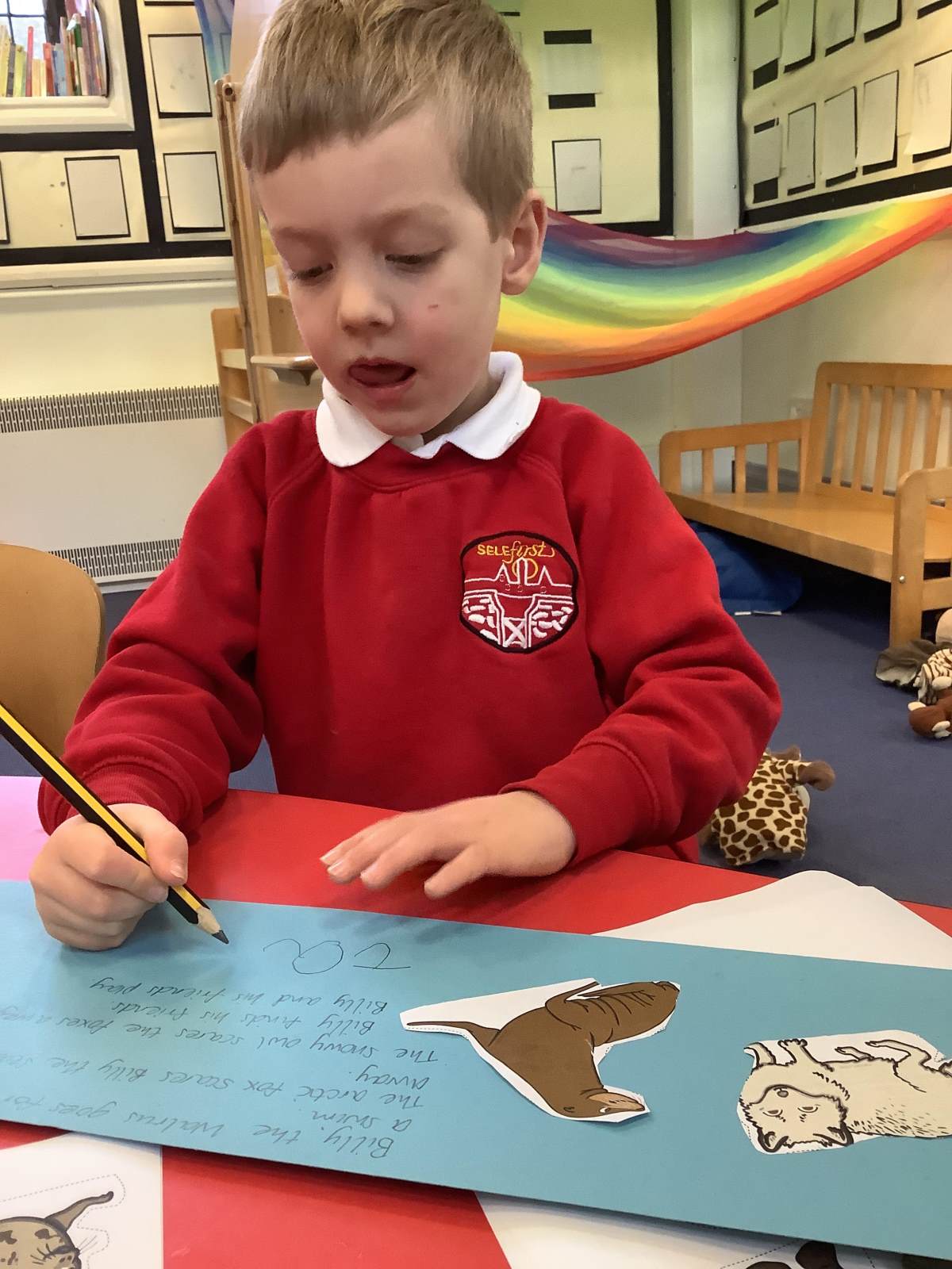 We have used arctic animals to make up our own stories, thinking about who is in our story, where they go and what they do.