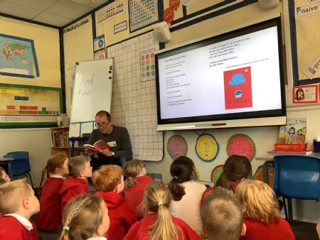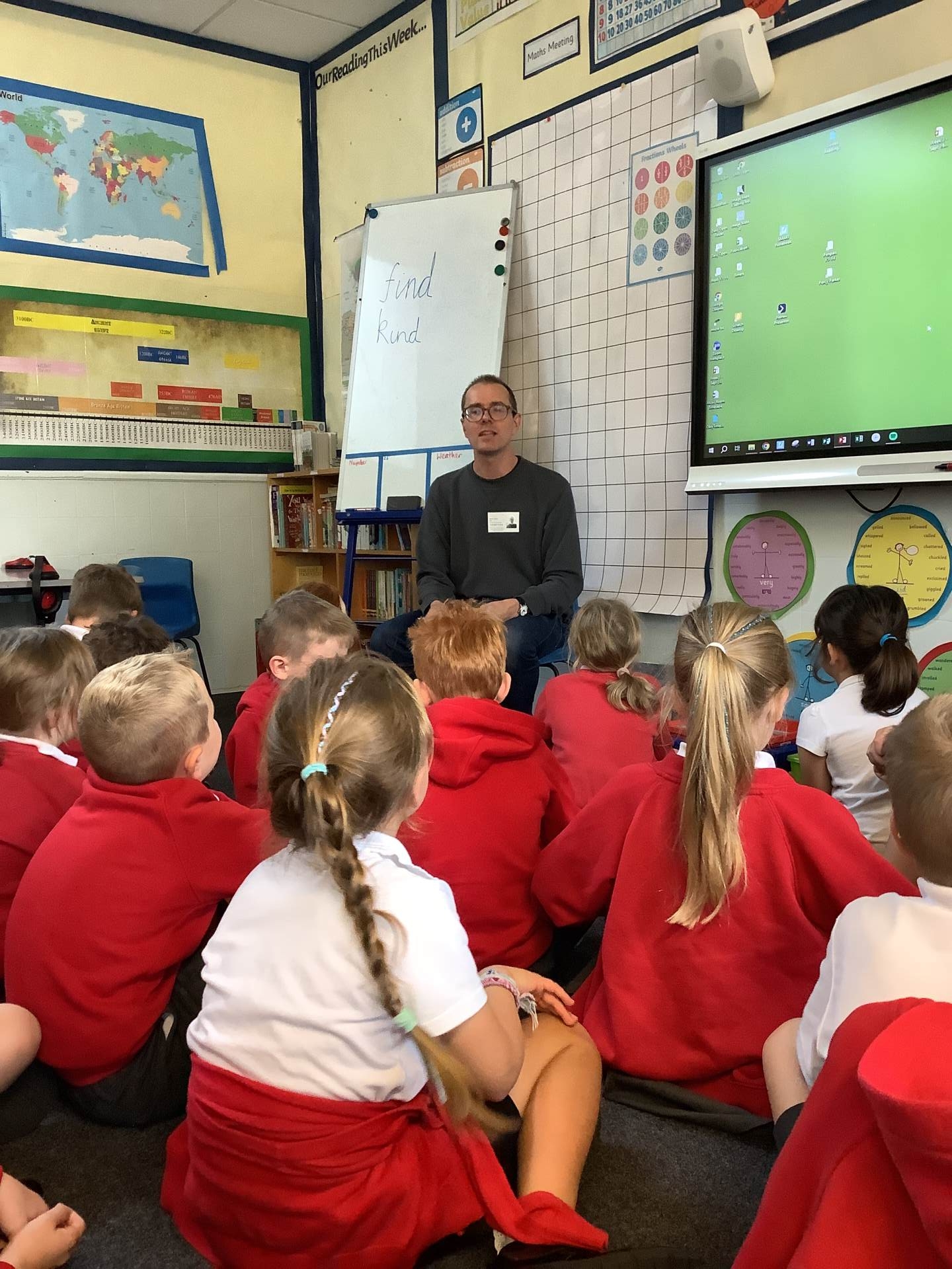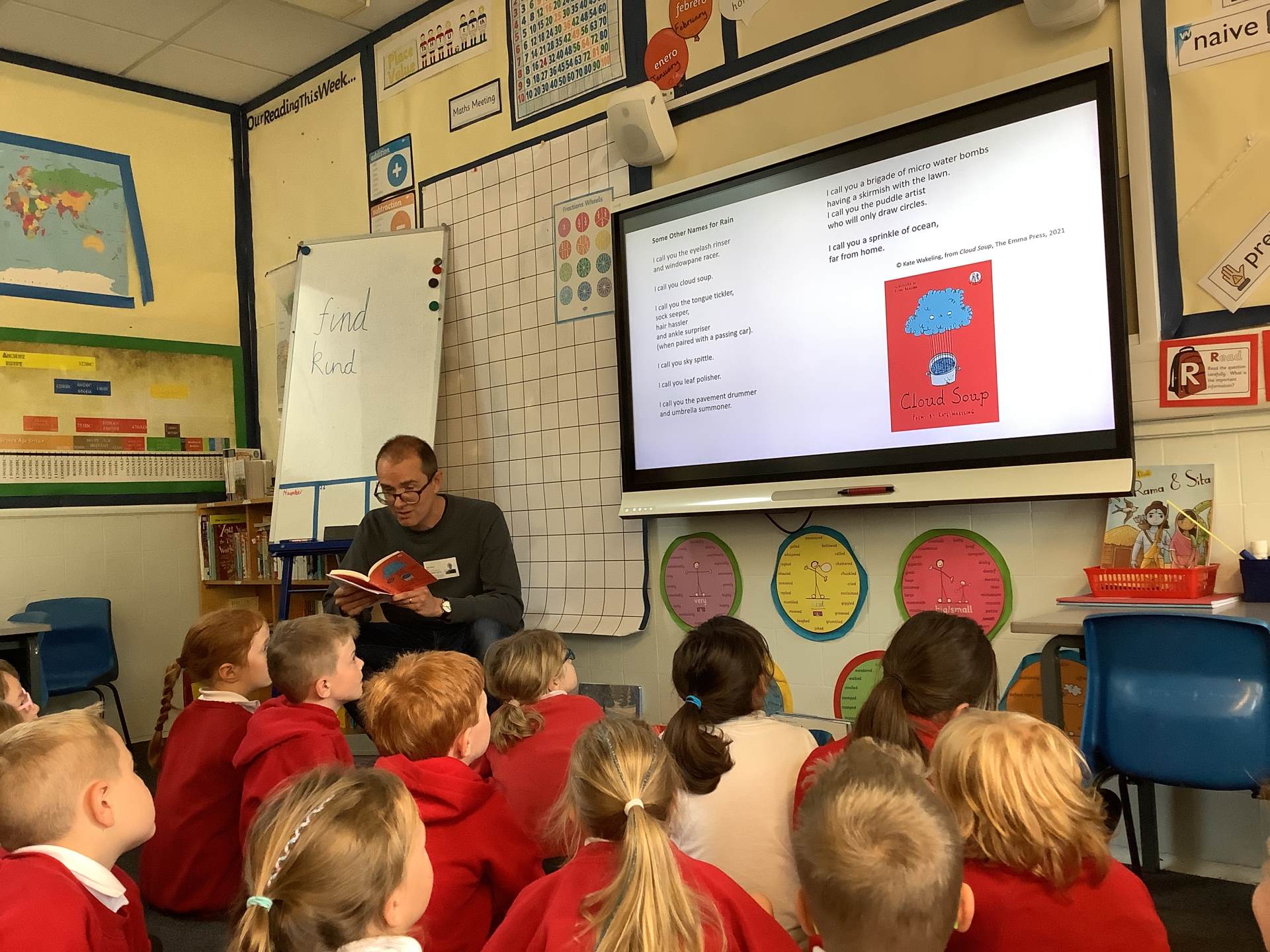Over the past few weeks we have been learning about poetry. On Thursday, we had a visit from Dr Martin Dubois, an expert in poetry! He talked to us about how poetry might look different on a page to a story, and how it's meant to be read aloud. He shared with us a poem about the different names for rain by Kate Wakeling. We especially loved 'tongue tickler' as a name for rain!