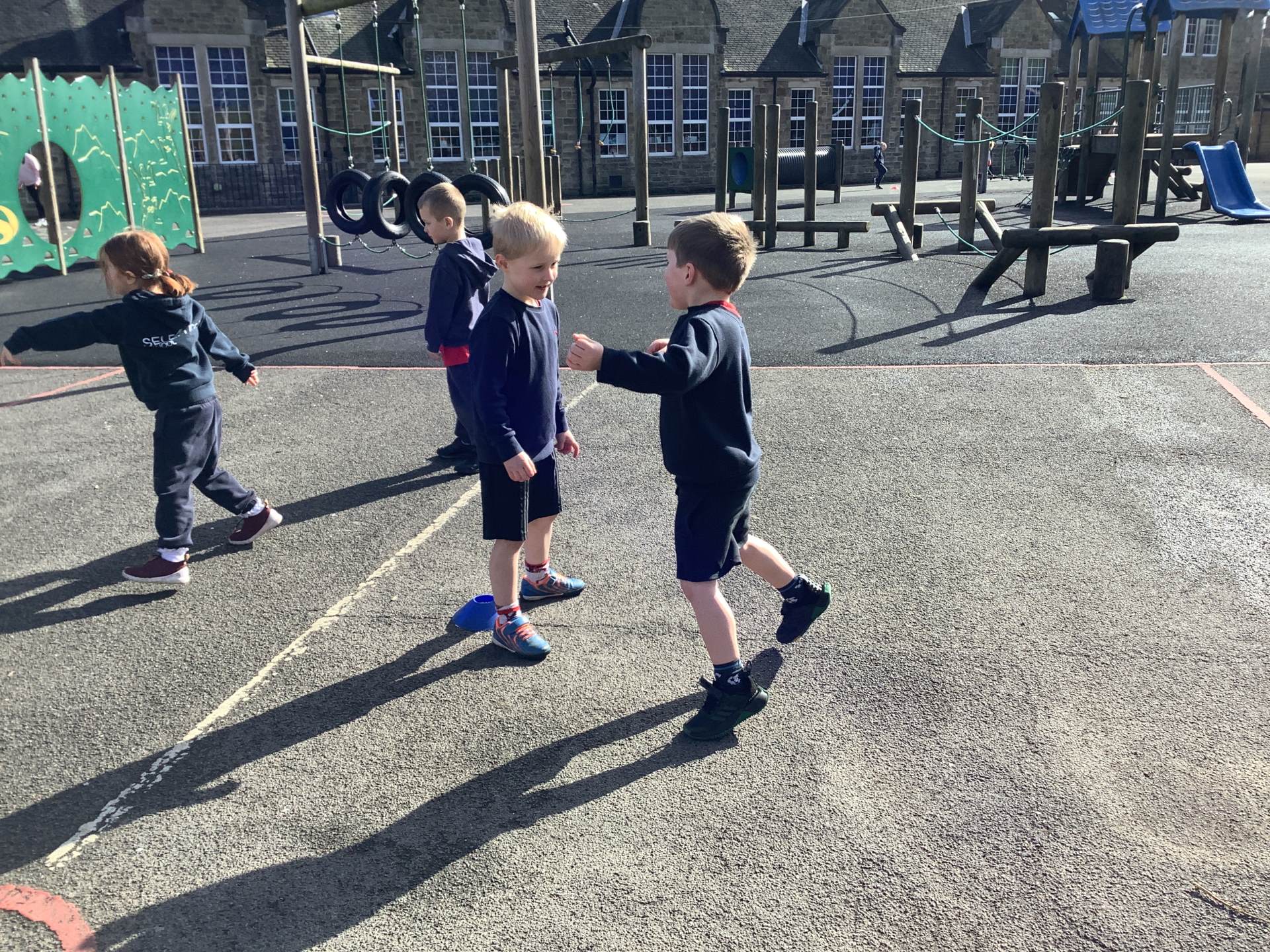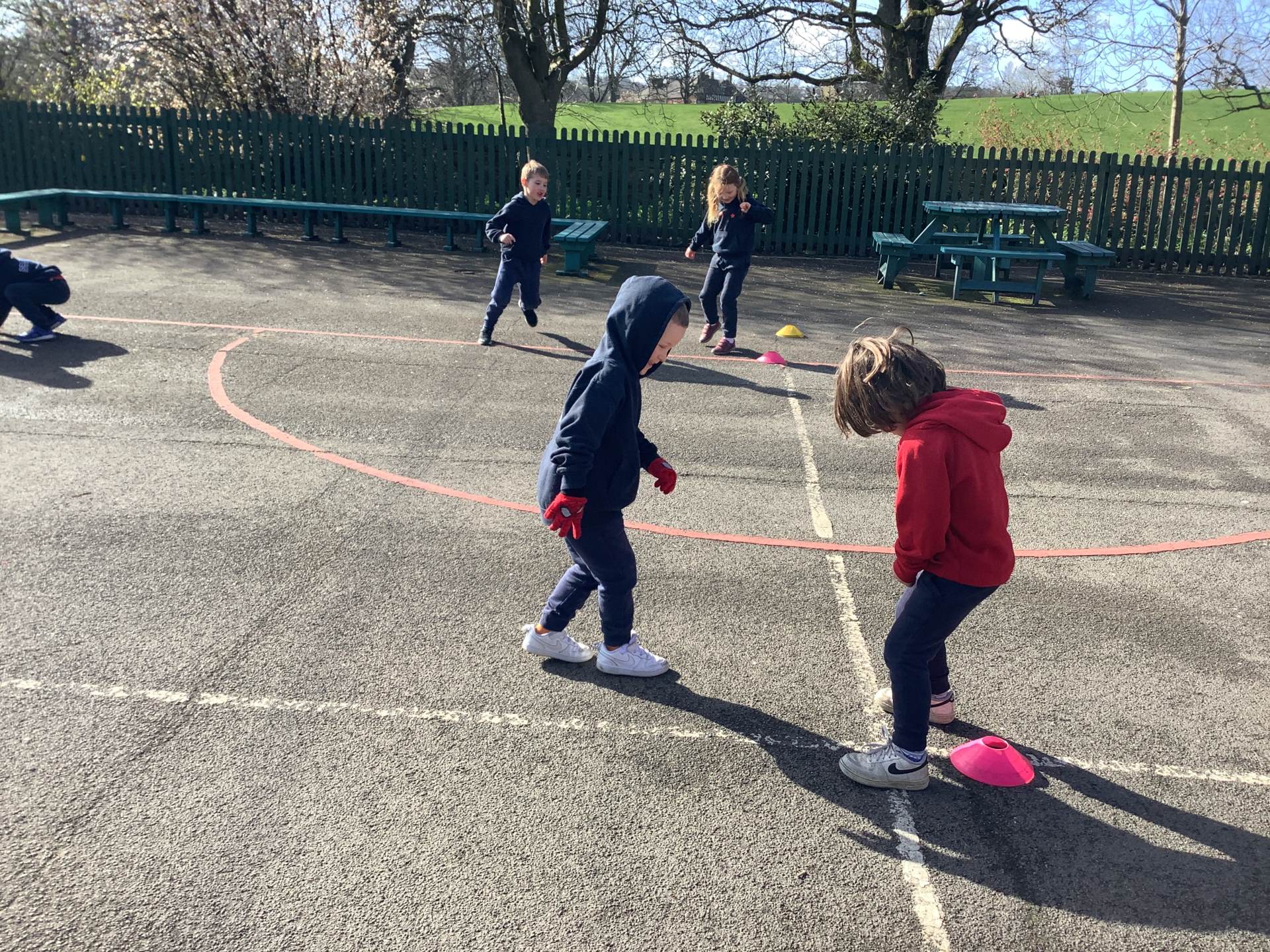 In PE, Reception are working on their Spring theme: 'challenging ourselves'. Playing a game of dragon and shadow, they practised defending and attacking.