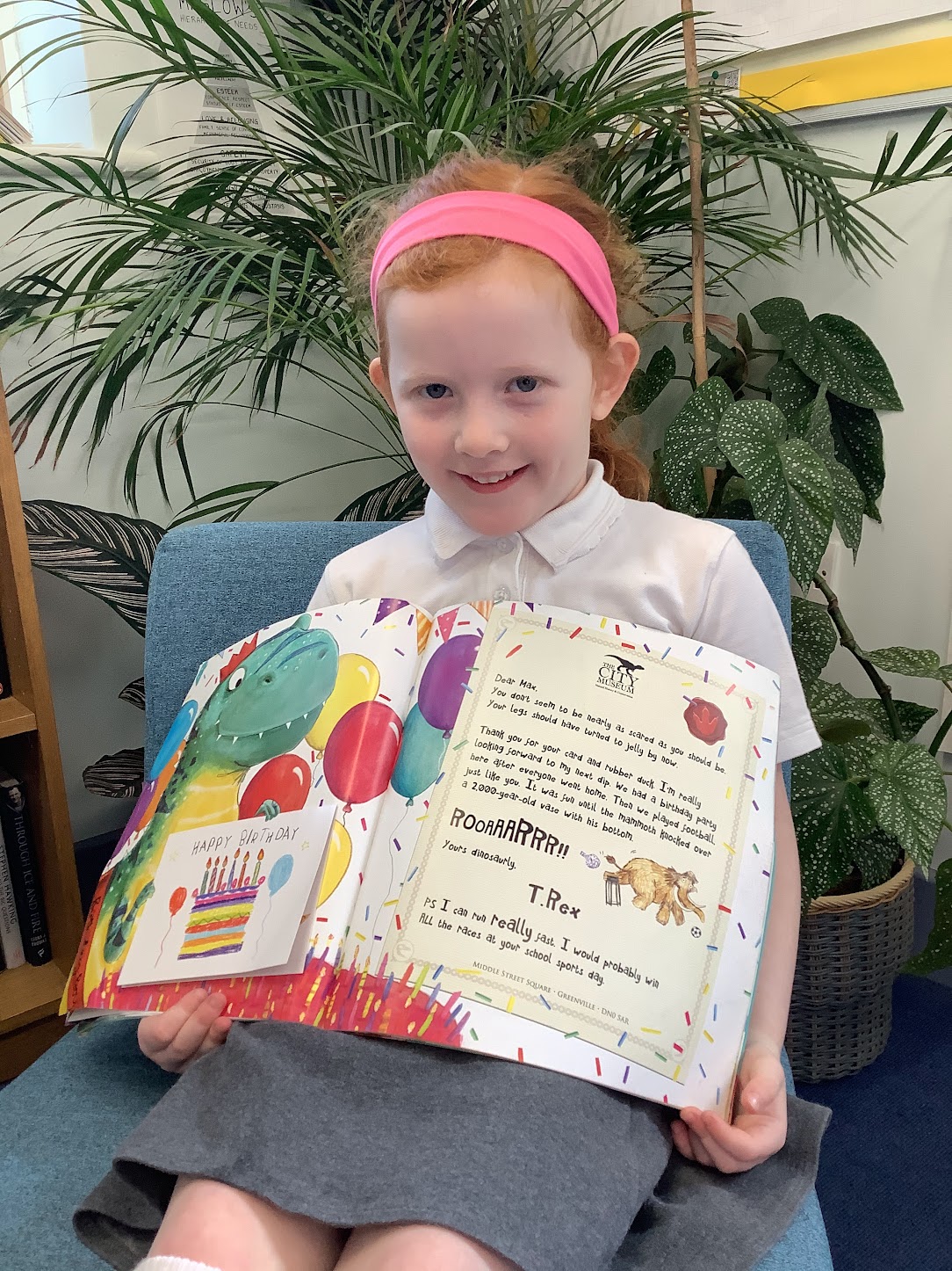 "I liked this book because it is about a cute dinosaur that lives in a museum. A little boy visits the dinosaurs at the museum and has lots of questions to ask so he writes letters to the dinosaur and guess what... he writes back! So the little boy sends him lots of different types of letters and cards and he just keeps writing back. It made our class laugh a lot."