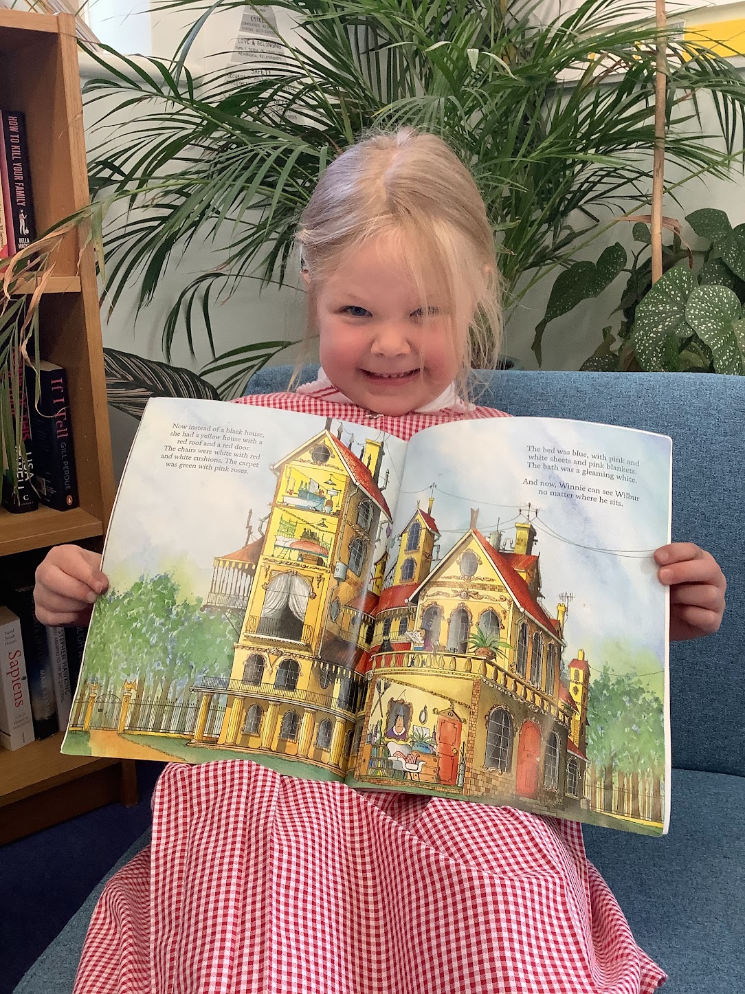 "Can I show you something really exciting? Look at this... At the start, Winnie's house is all black and dark and she can't see her black cat Wilbur so she keeps standing on him. Winnie waves her wand five times and says the magic word to turn him into a rainbow cat. Wilbur hides in a tree but all the birds laugh at him. But my favourite part is at the end when Winnie turns her house bright and colourful and Wilbur can be a black cat again!"
