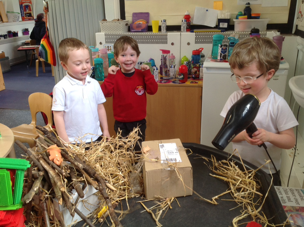 The children completed an experiment to build the three different types of houses and then had to see if they could blow them down using their breath, flapping card and then finally with a hairdryer! There were some brilliant conversations and predictions about what could happen!