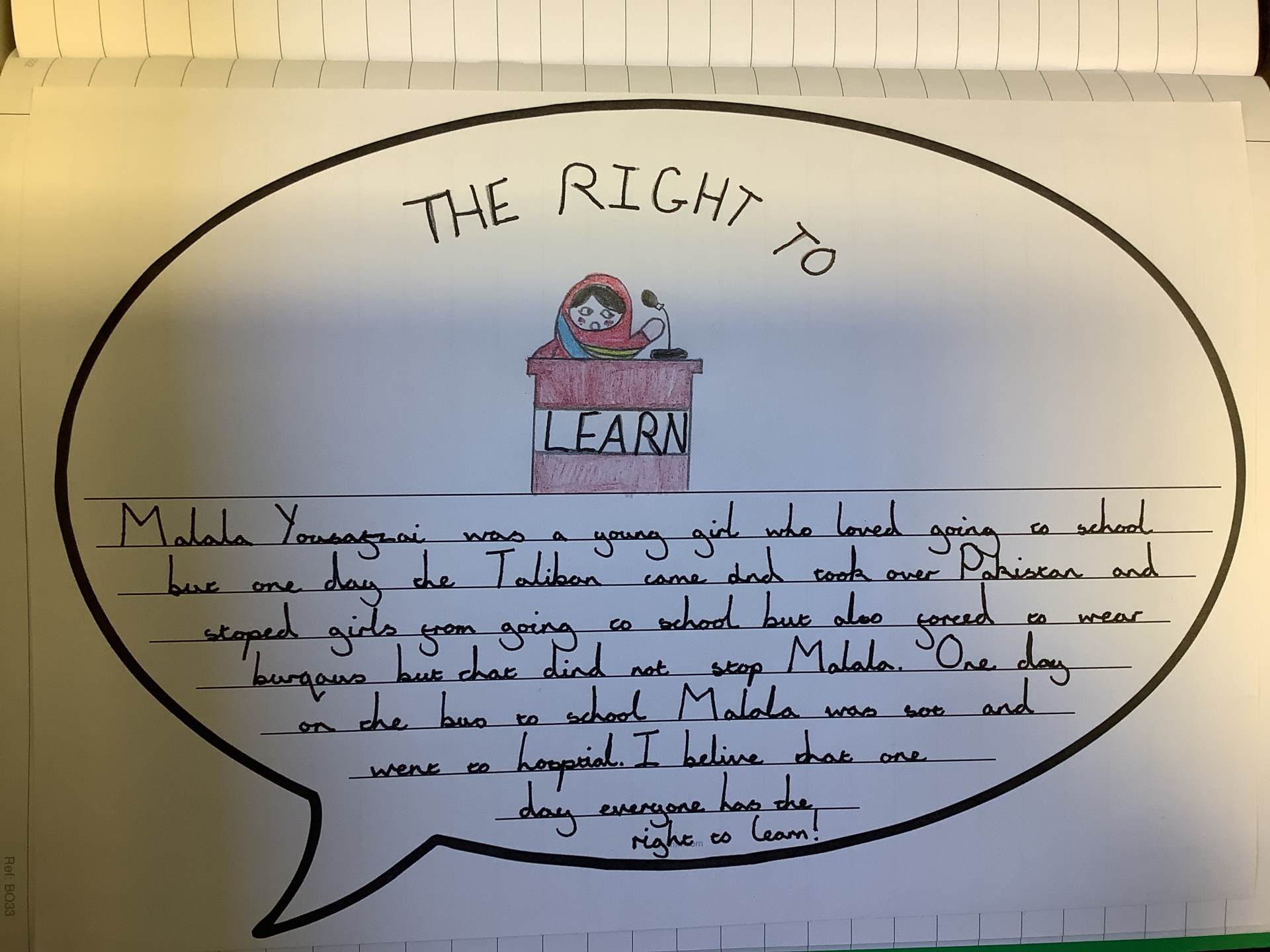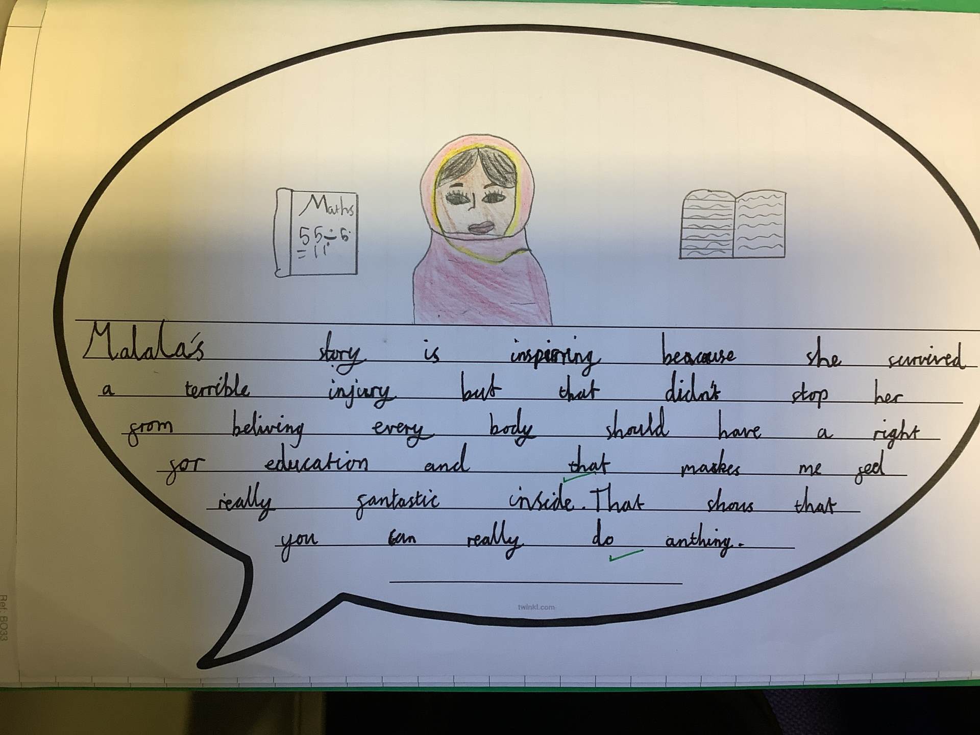 This week, Year 4 read about the life of Malala Yousafzai, a young girl who campaigned for equal access to education in Pakistan. Malala wrote a blog about the injustices happening in her country but was targeted because of this. Malala continues to fight for equal rights, giving inspiring speeches around the world. Year 4 wrote about how Malala’s story inspired them.
