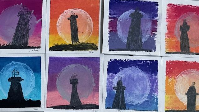 Using oil pastels, children created an amazing silhouette of Grace Darling's lighthouse with an evening background. The photos don't quite do the work justice!